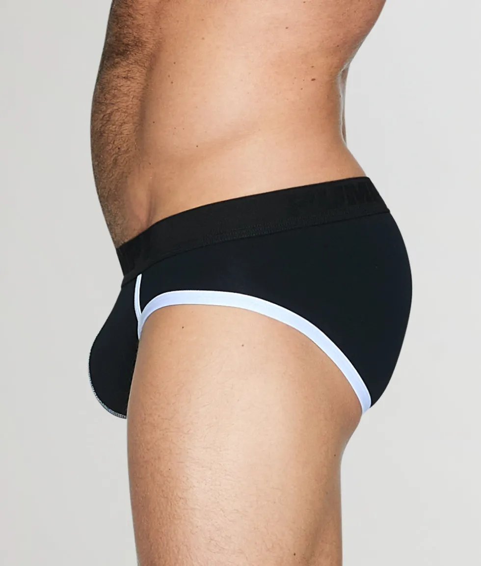 The PUMP! Lithium Brief is a mid-rise, athletic-style underwear that perfectly blends comfort and style. Its sleek, minimalistic design provides full coverage at the back, hugging your curves with a modern fit. The breathable micro-mesh fabric is soft to the touch, moisture-wicking, and cool, ensuring you stay dry and comfortable all day. The contour pouch offers added lift and support, enhancing your natural shape while keeping things secure. With a thick, no-roll waistband, this brief stays in place without cutting into the skin. Bold, contrasting details pop against the sleek design, adding a sporty edge. Perfect for an active lifestyle with a sleek and modern aesthetic.